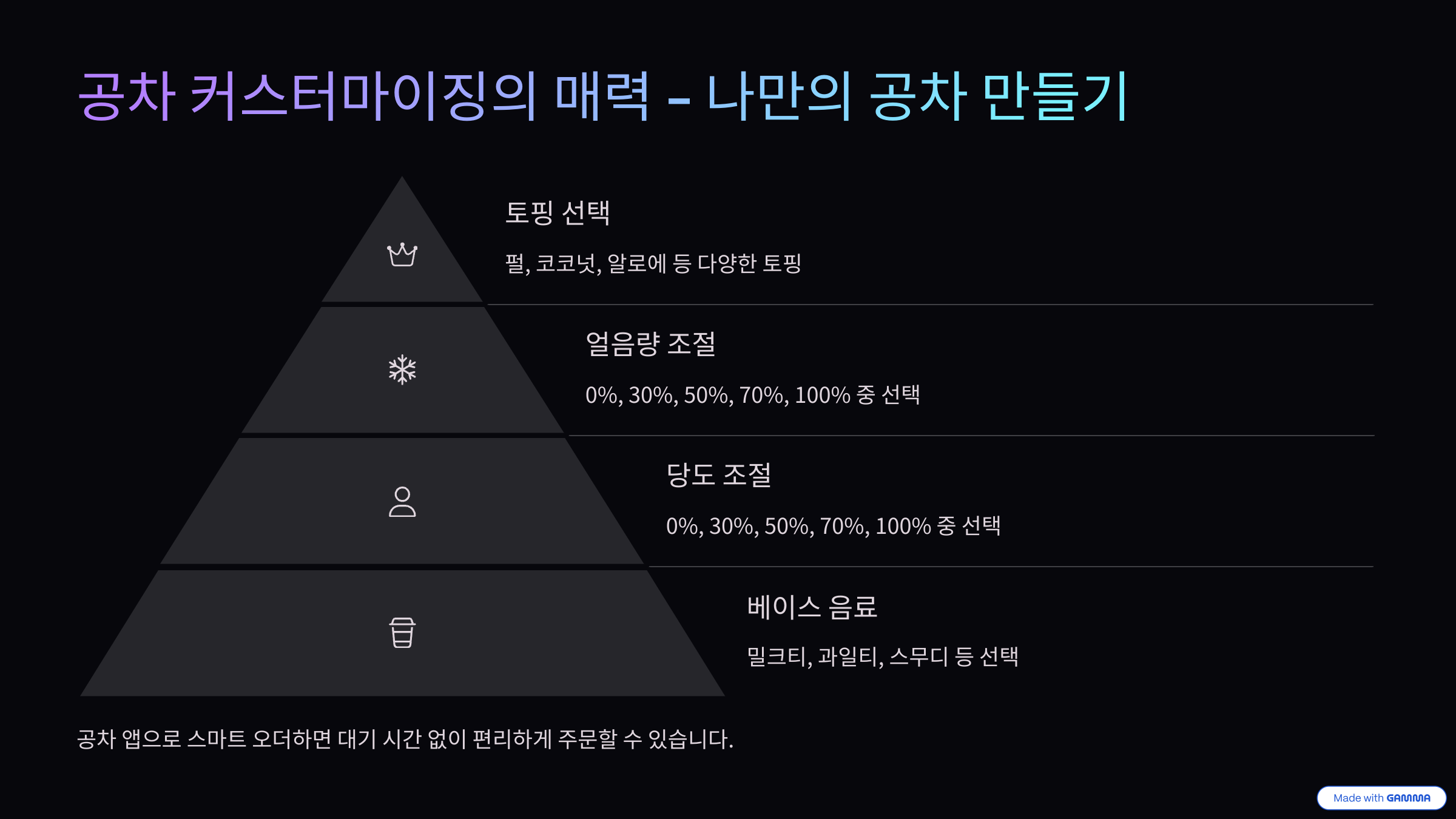 공차는 기본 음료 선택 이후 당도, 얼음양, 그리고 토핑까지