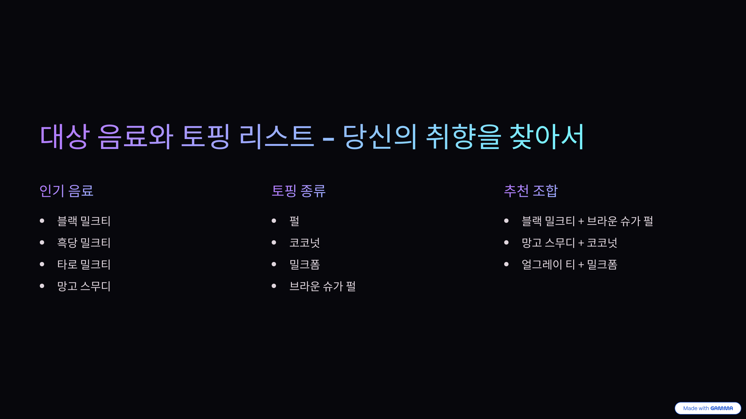 대상 음료와 토핑 리스트 - 당신의 취향을 찾아서