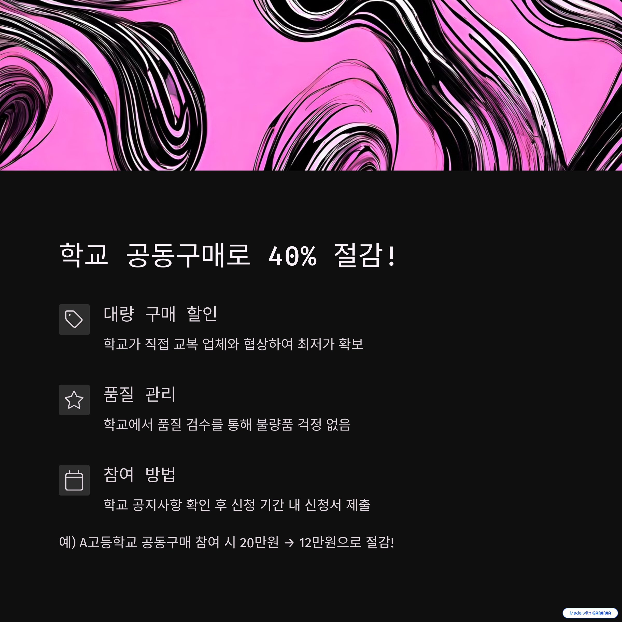 "학교 주관 공동구매에 참여하면 교복 가격을 크게 줄일 수 있습니다."