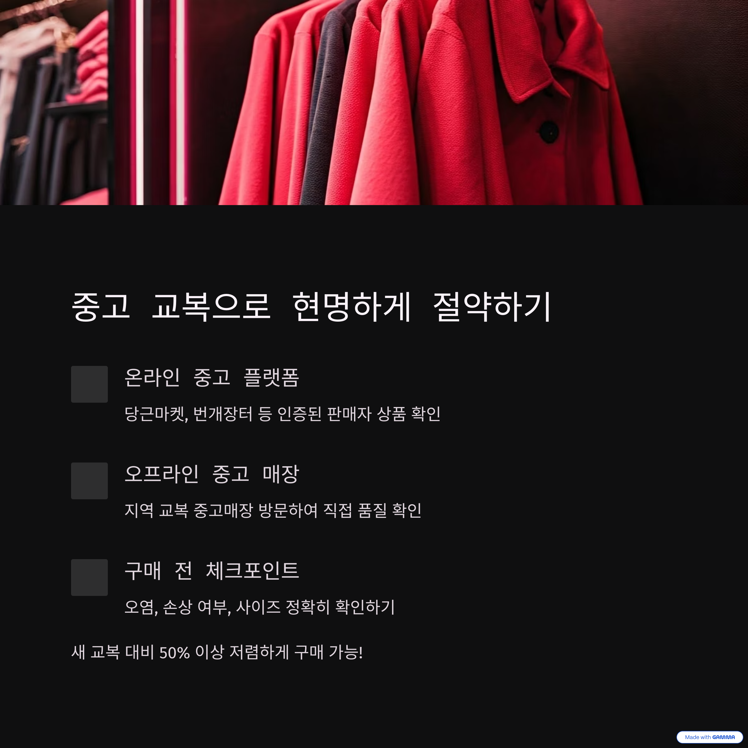 "교복은 구매 시기를 잘 맞추면 최대 반값까지 절약할 수 있습니다."