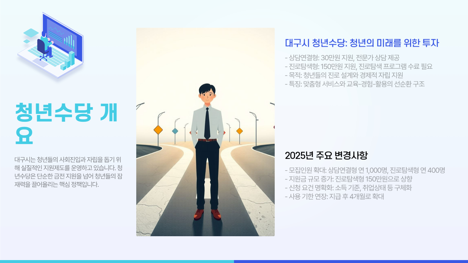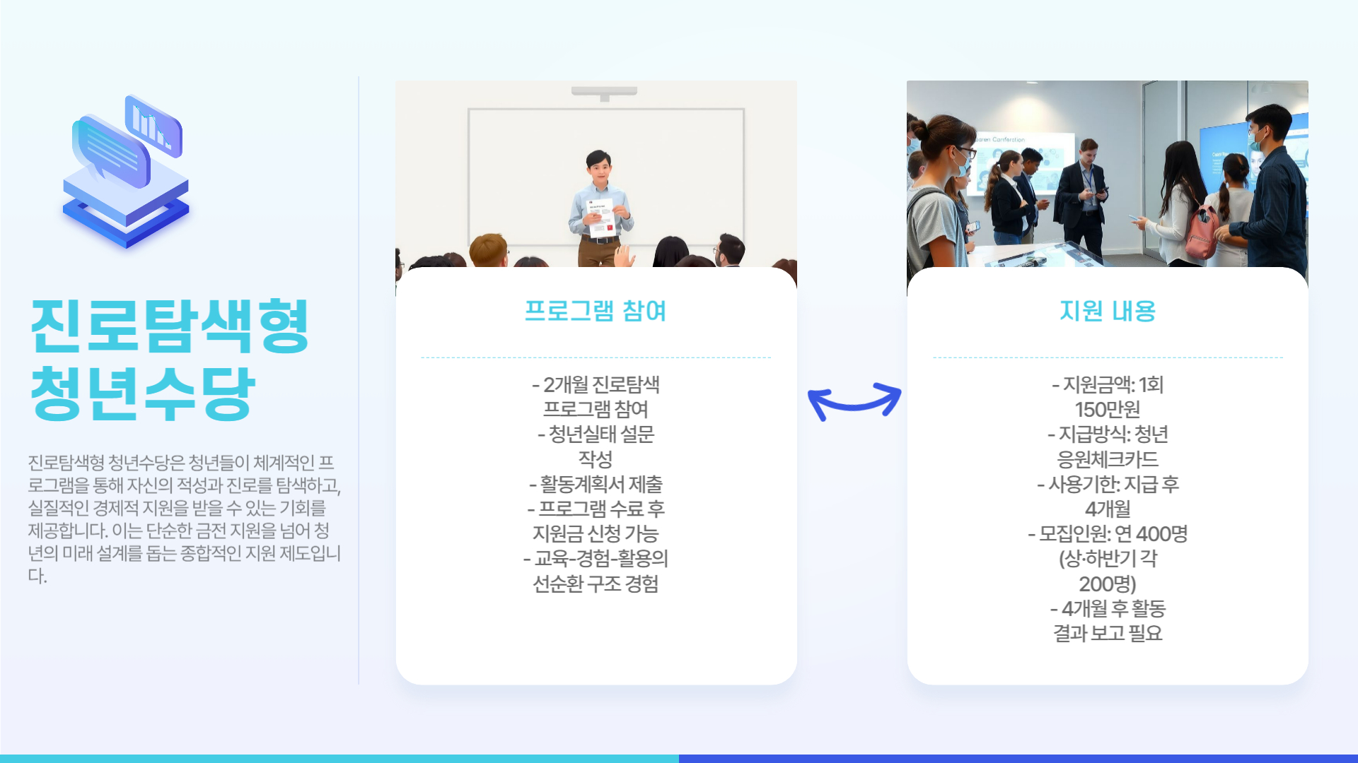 상담연결형과 진로탐색형 두 가지 형태의 청년수당을 운영하고 있습니다.