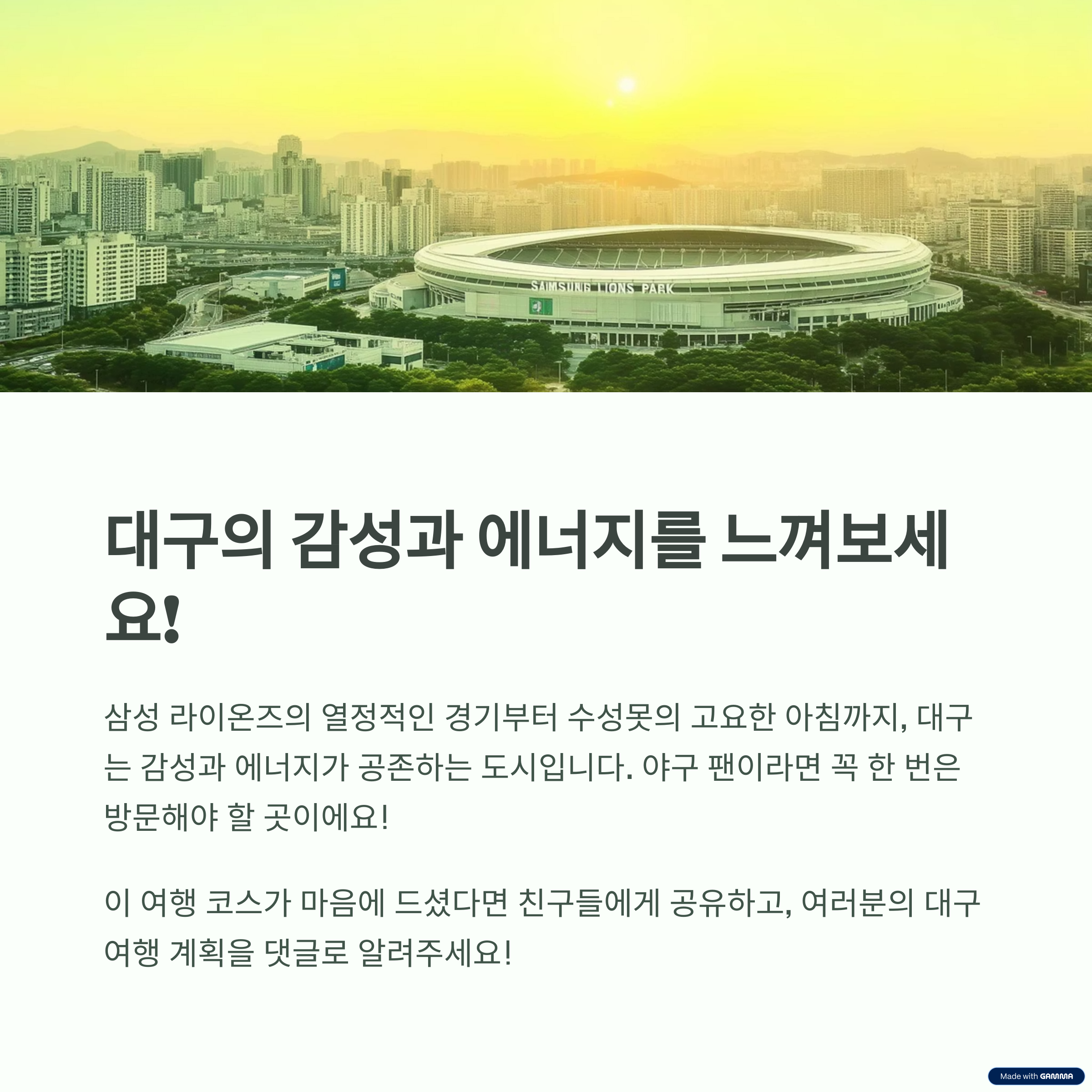 이틀이라는 짧은 시간이었지만, 삼성 라이온즈의 열정적인 경기부터 수성못의 고요한 아침까지...