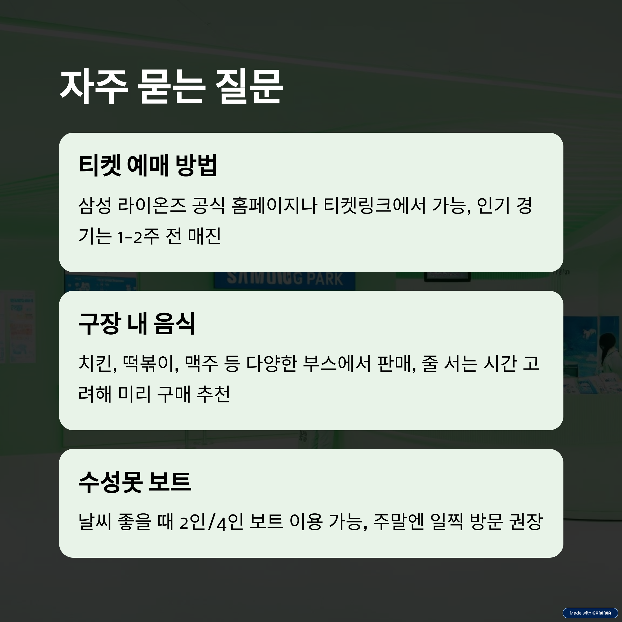 삼성 라이온즈 공식 홈페이지 또는 티켓링크 등 예매 사이트에서 미리 예매하실 수 있습니다. 인기 경기는 1~2주 전 매진되는 경우도 많아요!