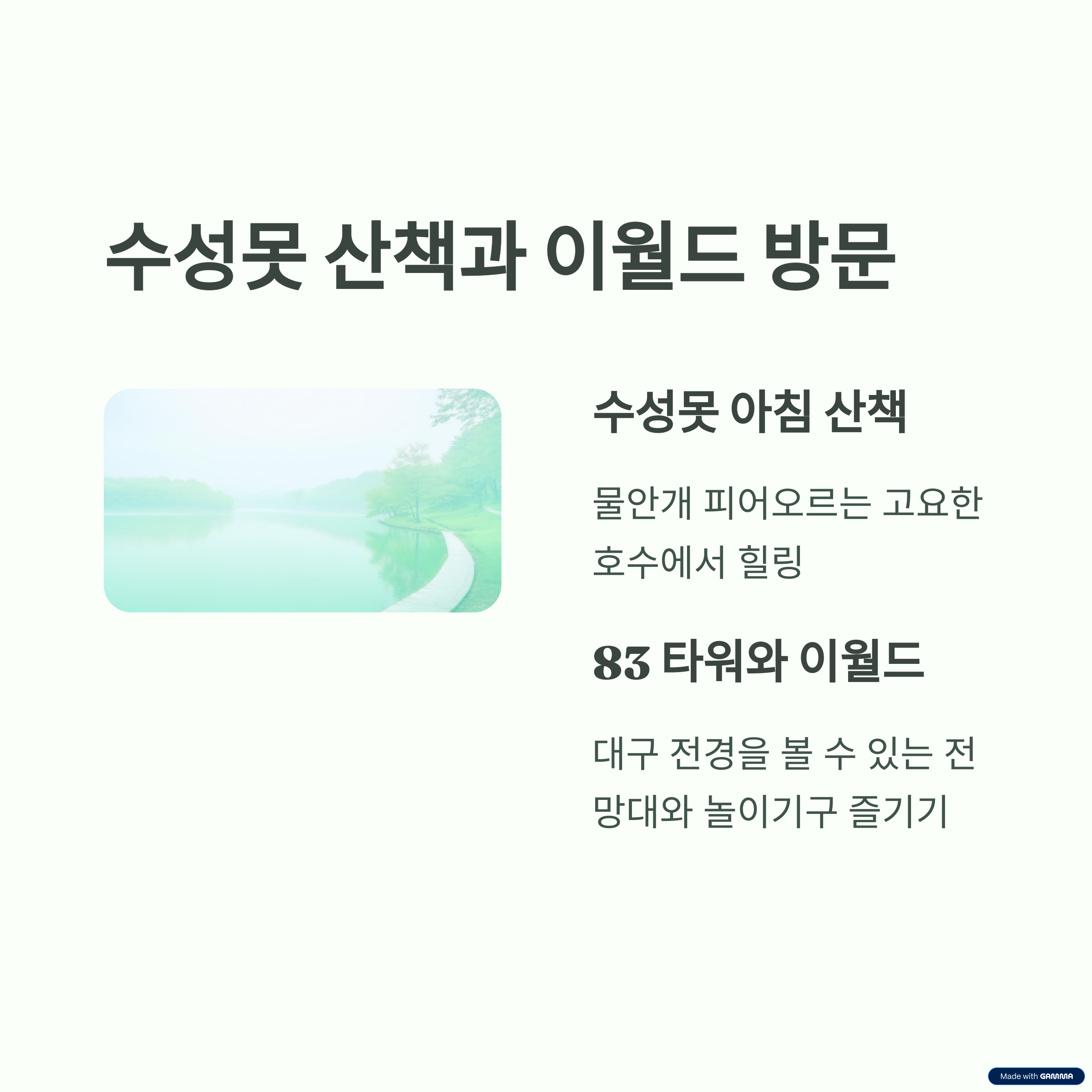 둘째 날 아침은 수성못에서 시작했어요. 물안개가 피어오르는 고요한 아침 호수, 그 옆을 걷는 것만으로도 힐링이 되더라고요.