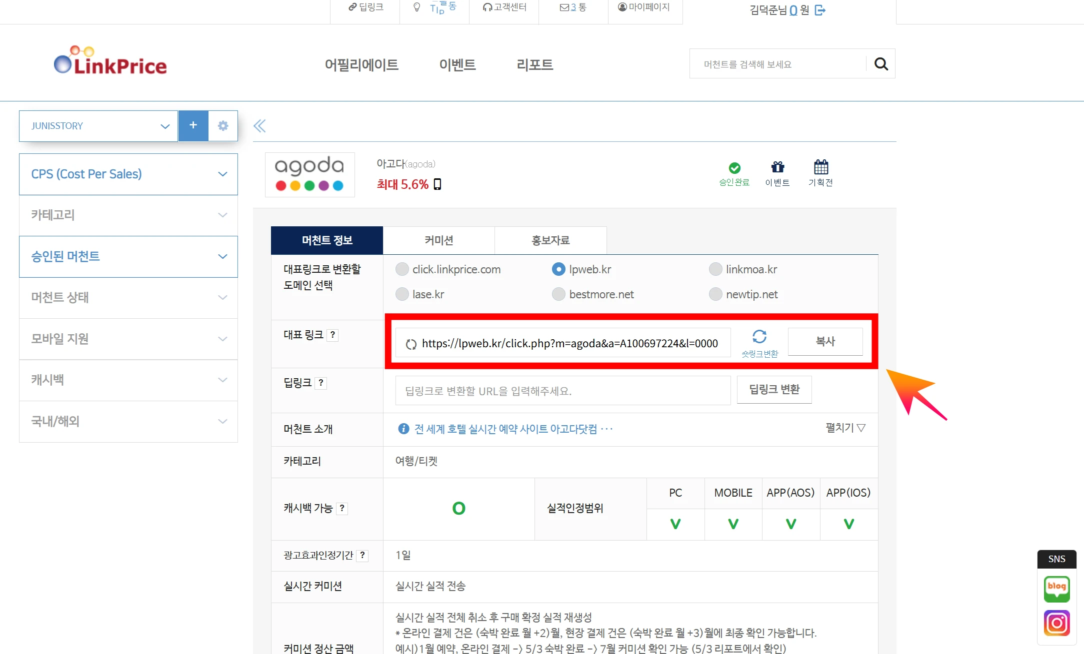 - 승인된 광고주를 클릭하면 하단에 '대표링크'나 '나만의 링크(딥링크)' 메뉴가 있어요.