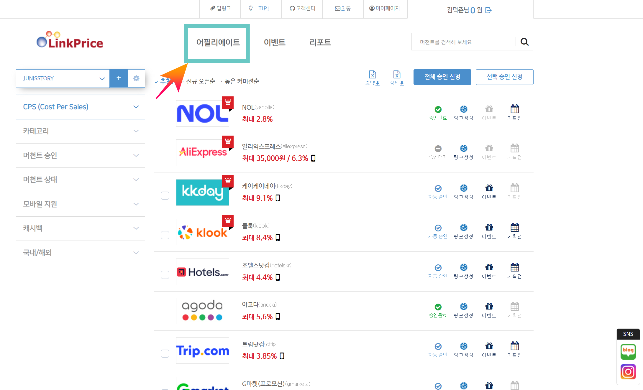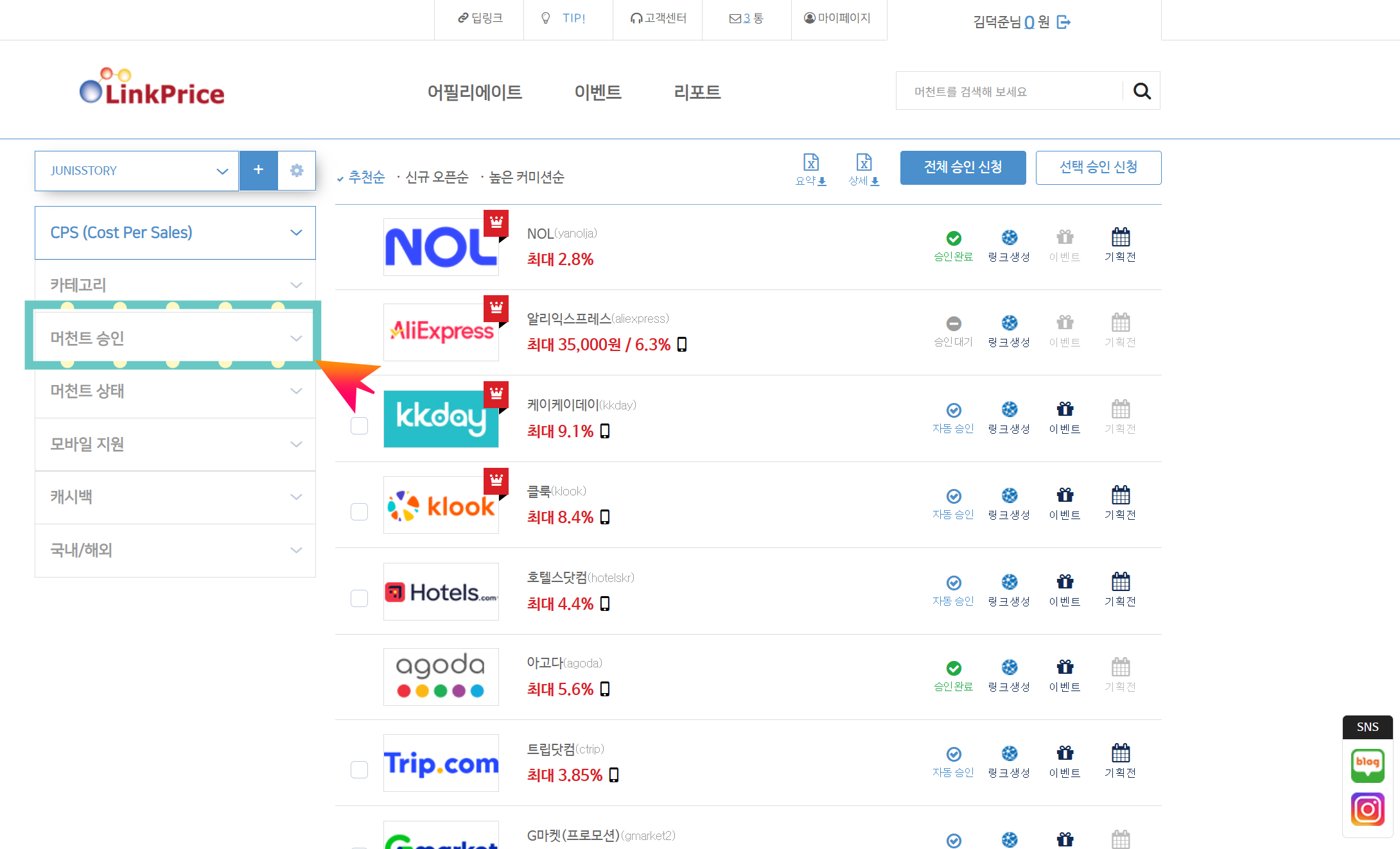 - 상단 '머천트(Merchant)' 탭으로 가서 마음에 드는 광고주를 찾아보세요. 쇼핑, 여행, 금융 등 정말 다양하답니다.