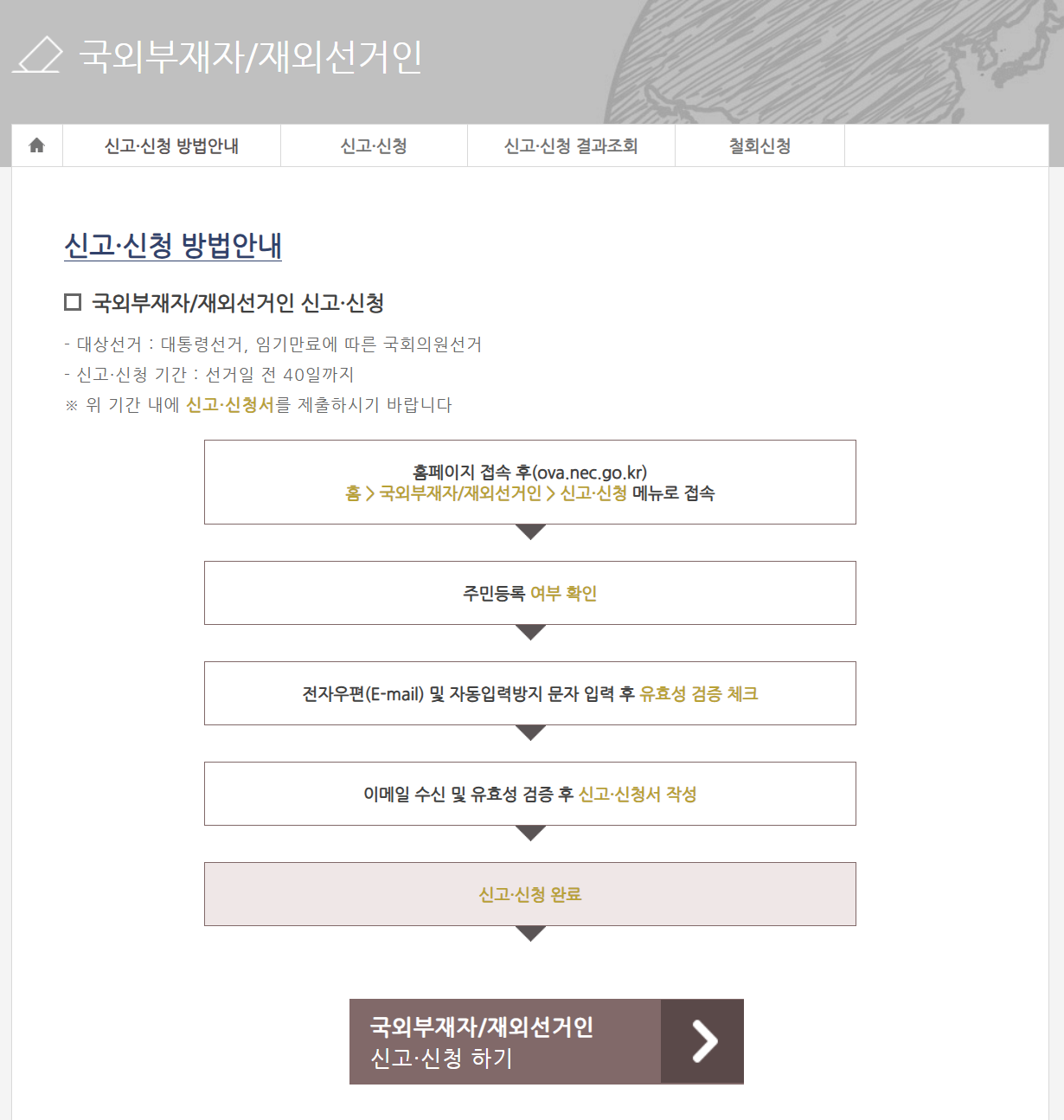 | 신청 방법 | 온라인(ova.nec.go.kr), 방문, 우편, 이메일, 대리 신청 가능(일부) | |