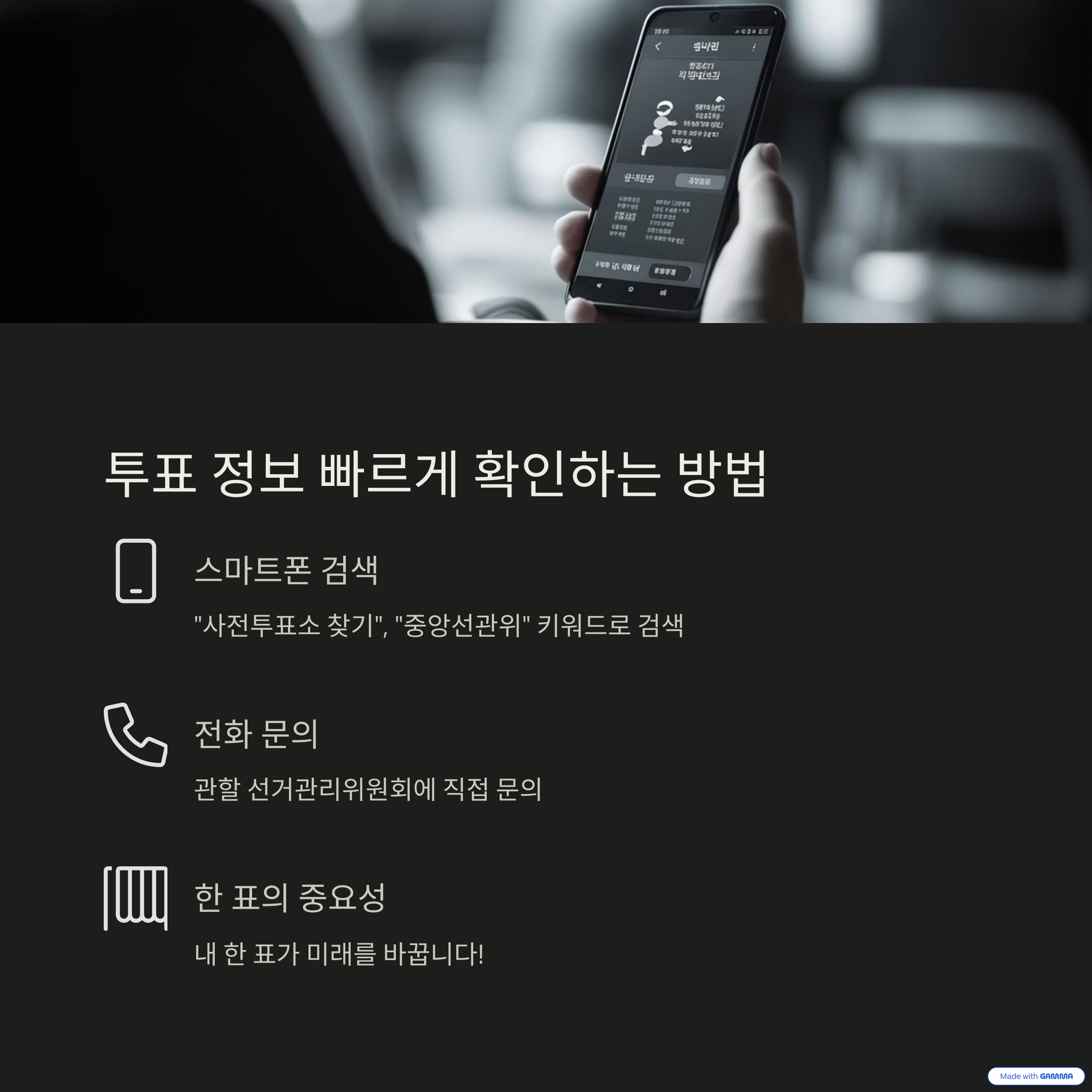 급할 때는 스마트폰 포털에 “사전투표소 찾기”, “중앙선관위”만 검색해도 대부분의 정보를 얻을 수 있어요. 또 궁금한 점은 관할 선거관리위원회로 전화하면 친절하게 안내받을 수 있답니다. 무엇보다 중요한 건, 내 한 표가 미래를 바꾼다는 사실이에요!