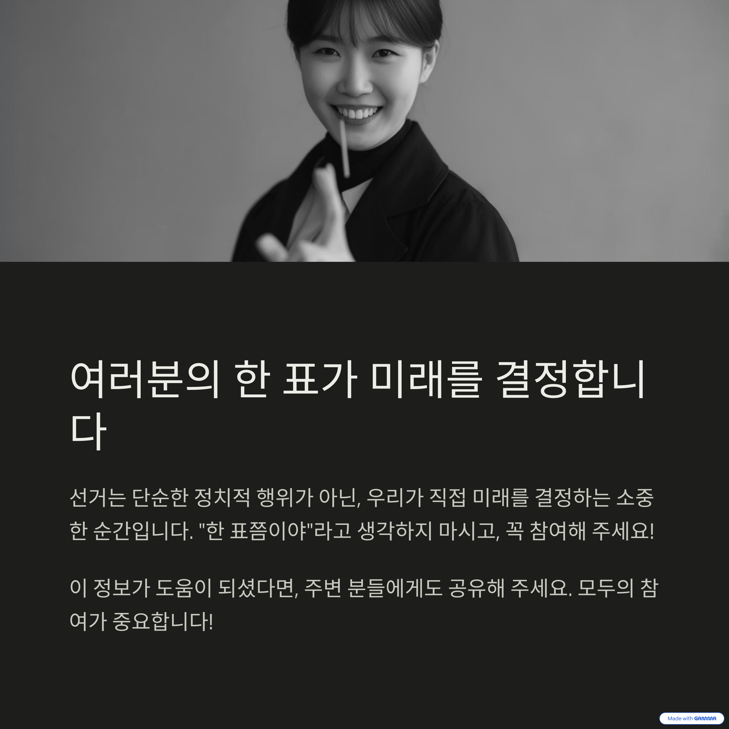 마지막으로 한 가지만 더 말씀드릴게요. 선거란 건 단순히 정치적 행위가 아니라, 우리가 직접 미래를 결정하는 소중한 순간이잖아요. 괜히 “한 표쯤이야” 생각하지 마시고, 꼭 참여해 주세요.