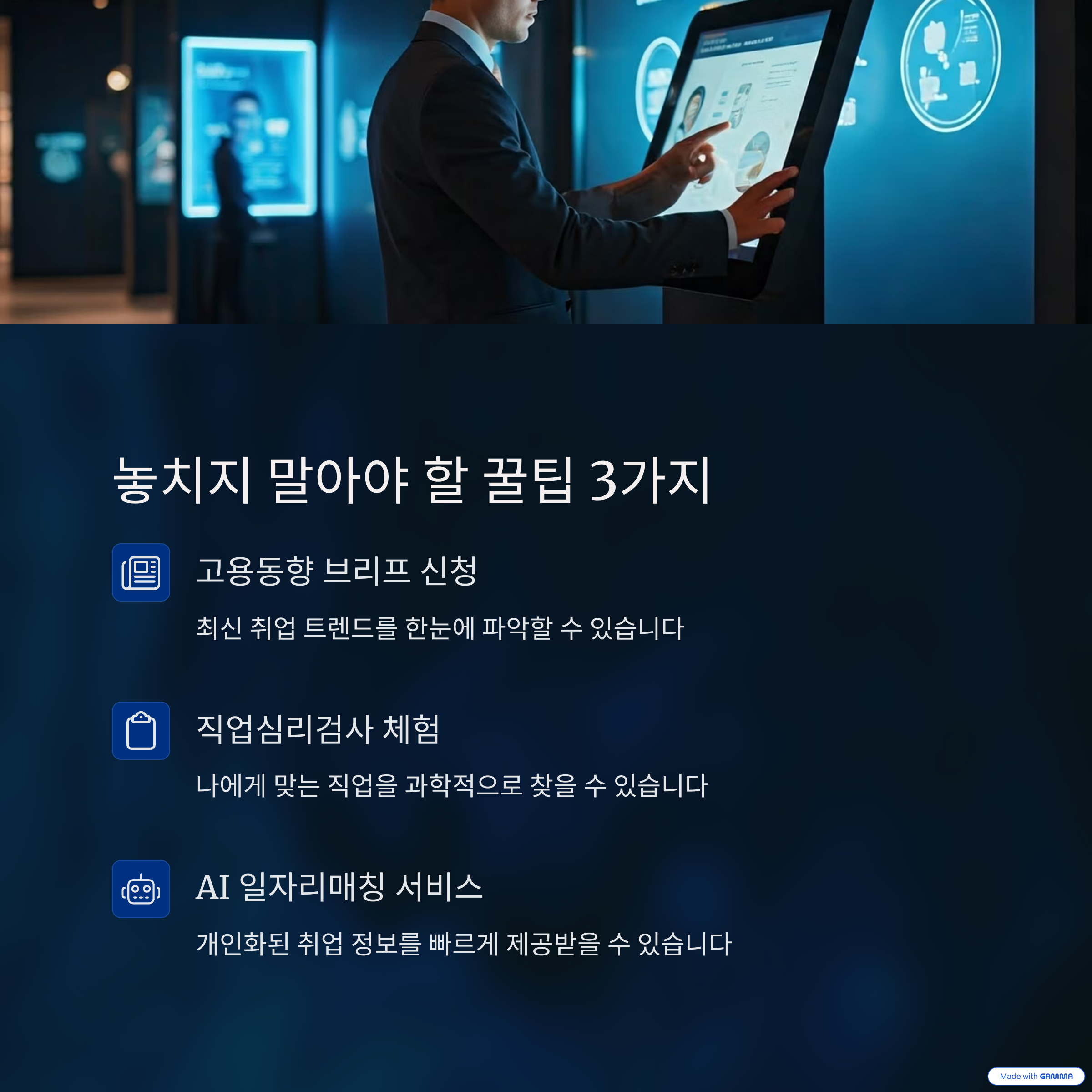 - AI 일자리매칭 서비스 이용하기: 개인화된 취업 정보를 빠르게 제공합니다.