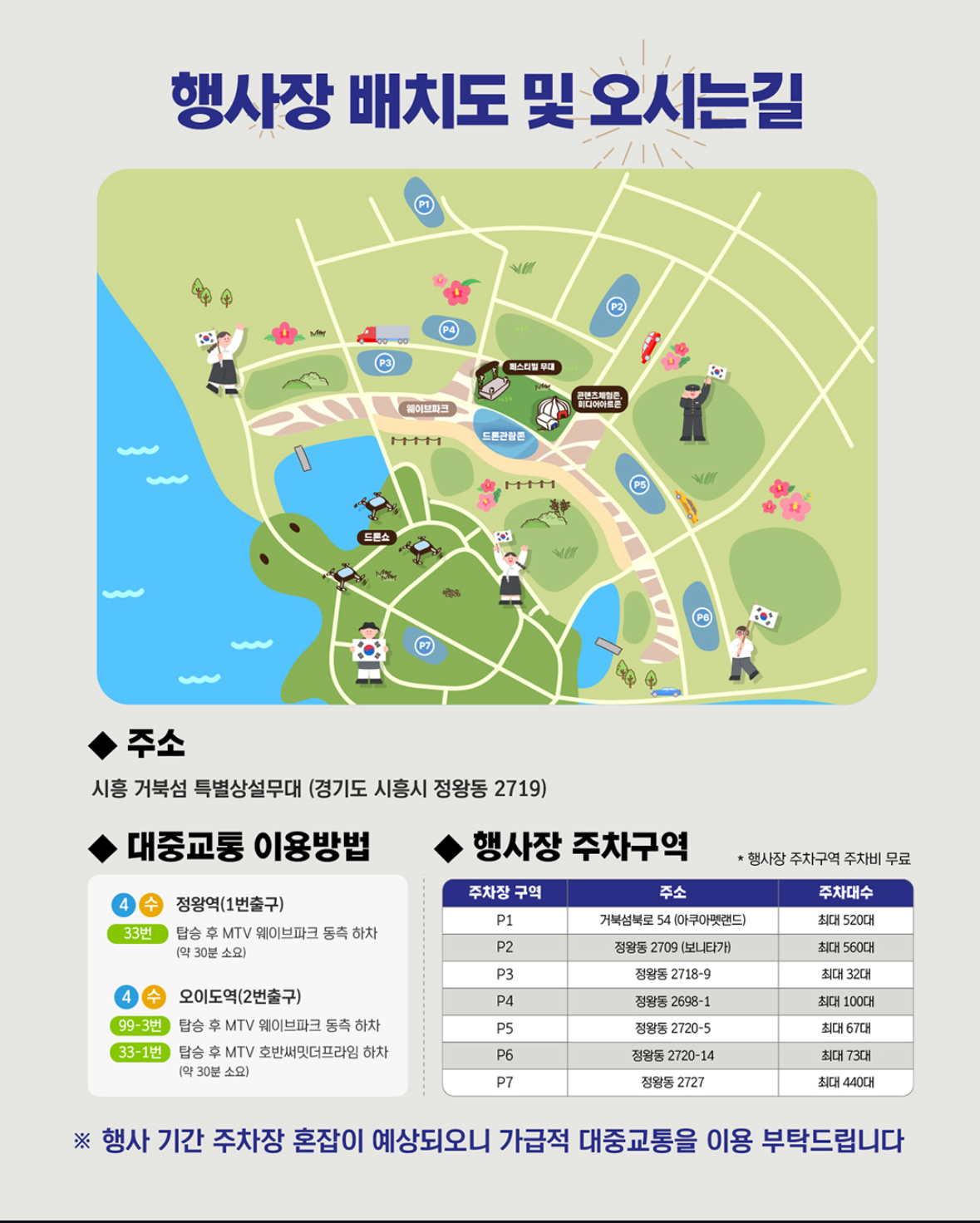 행사장 앞 P3 공영주차장은 약 32대만 주차 가능하므로 조기 만차가 예상됩니다.